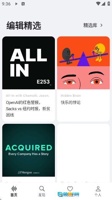 2、浏览编辑精选内容:可在首页查看编辑推荐的播客节目,若想了解更多内容,点击“精选库”即可。