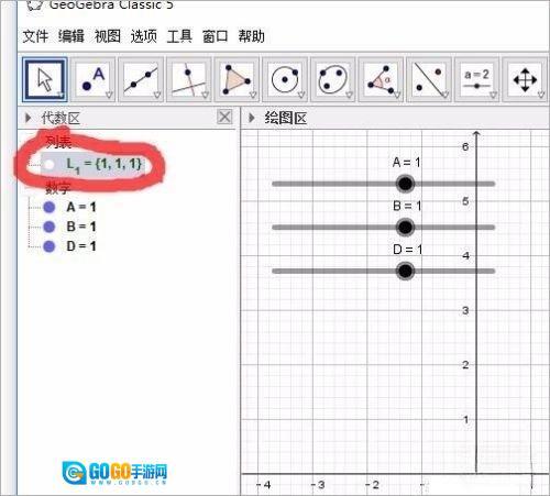 2、完成输入后按下回车键,系统会生成三个带有滑动条的数字变量,此时在代数区能够获取到包含三个数字的列表L1。