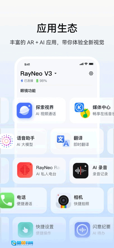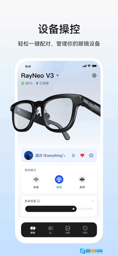 通过蓝牙配对连接手机和眼镜两端,实现对眼镜系统的精确控制,如调节音量、手势设置、更新眼镜系统等功能;