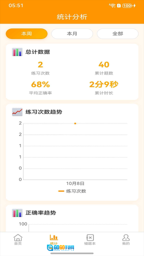 1、借助图表等可视化形式,清晰展示练习次数的变化趋势与正确率的波动趋势,帮助用户直观、快速地了解自身的练习进展情况。