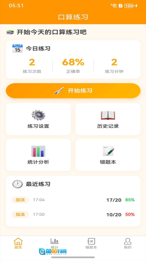3、可记录用户过往的练习情况,涵盖练习的运算类型、时间、完成题数以及正确率等信息,便于用户回顾自己的练习历程。
