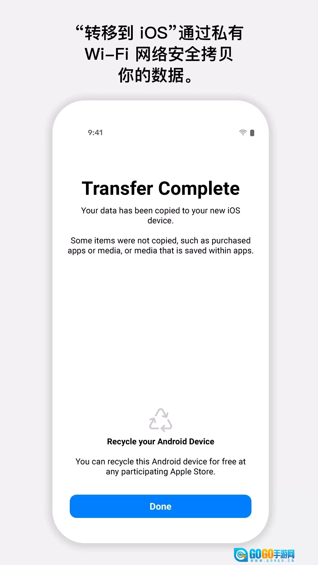 当iOS设备上的载入条走完后,轻点安卓设备上的“完成”按钮。接着在iOS设备上点击“继续”,并依据屏幕提示完成iOS设备的相关设置。
