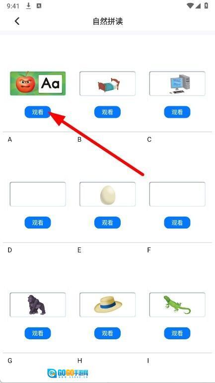 2、找到与字母对应的观看按钮,点击后即可进入拼读视频的播放界面。