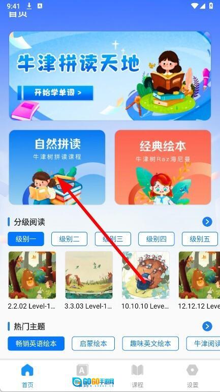 1、启动软件后,在首页找到并点击自然拼读板块,即可进入自然拼读的学习页面。