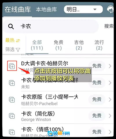 2、从曲库中找到你想演奏的歌曲,点击左侧的加号,就能把它添加到播放列表里。