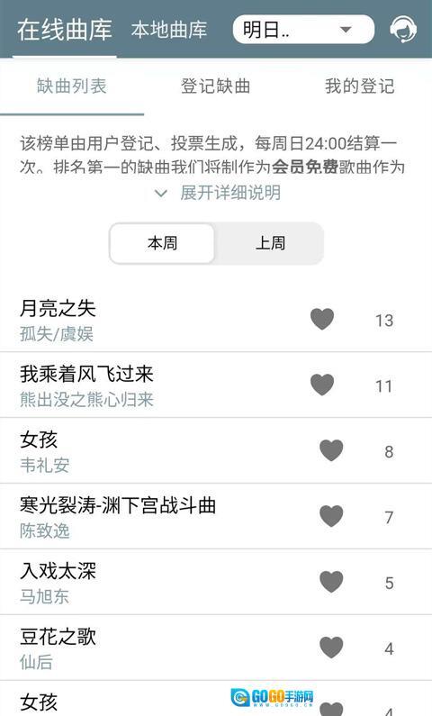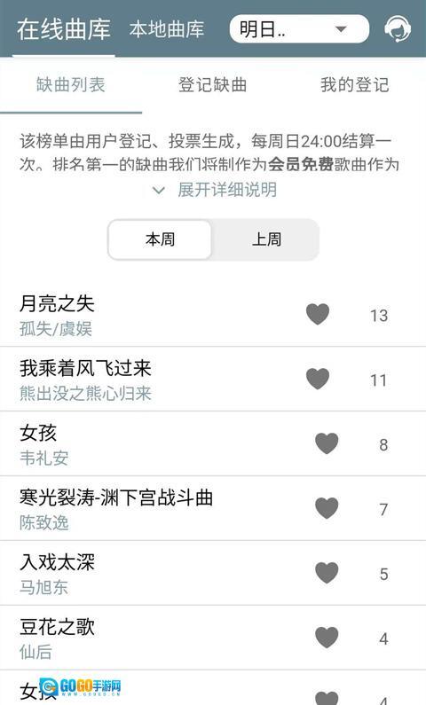 - 提供缺曲登记服务,我们会把用户每周登记的缺曲添加到曲库中,以此保证曲库持续更新。