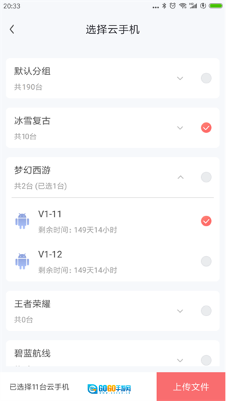 2、在群控管理功能的弹窗中选择“文件上传”选项,页面会跳转至云手机选择界面,接着挑选需要进行批量文件上传操作的云手机或任务组,最后点击“上传文件”按钮即可。