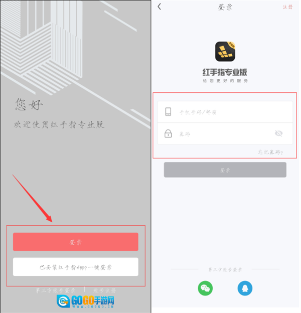 1、启动红手指专业版,点击登录按钮,用户于界面输入账号和密码即可登录该应用,后续使用无需重复登录;