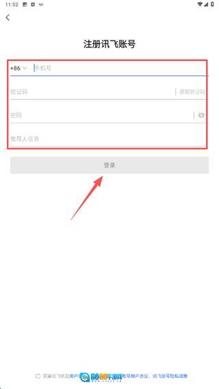 4、进入讯飞账号注册页面后,按顺序填写手机号码、验证码、密码,推荐人信息为选填项,填写完毕后点击登录按钮,即可完成账号注册流程。
