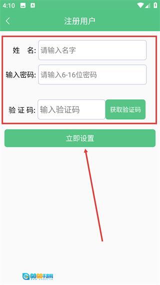 在注册用户页面,依次填写姓名、设置6-16位的密码、获取并输入验证码,随后点击“立即设置”按钮,就能完成账号注册,该账号可用于登录家校共育平台。