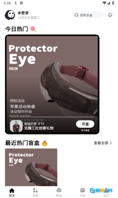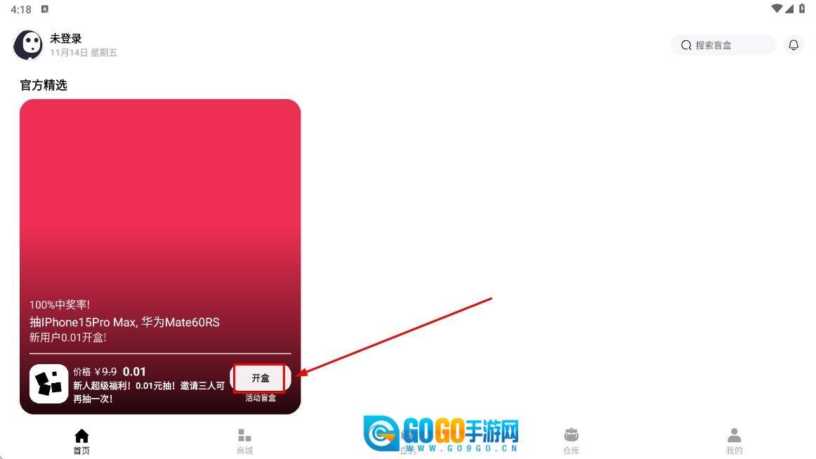 3、完成登录操作后回到首页,找到并点击【开盒】功能按钮,即可参与新人福利抽奖活动。