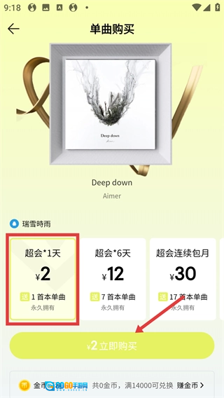 4、进入单曲购买页面后,先选择套餐,再点击【立即购买】按钮,即可完成购买操作。