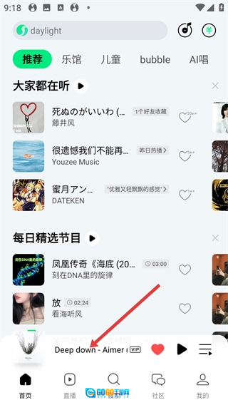 1、启动QQ音乐应用,找到底部播放栏中的【Deep-down-Aimer】并点击,即可进入该歌曲的播放界面。