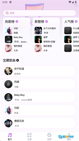 首页配备了海量经典歌曲资源,同时涵盖了各类热门歌曲排行榜单。