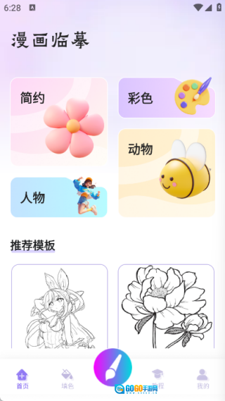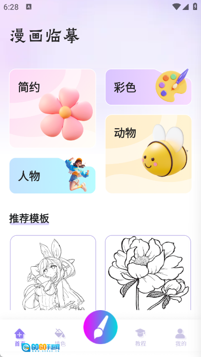 首页提供了简约、彩色、人物、动物等多种临摹素材,同时也配备了推荐模板。