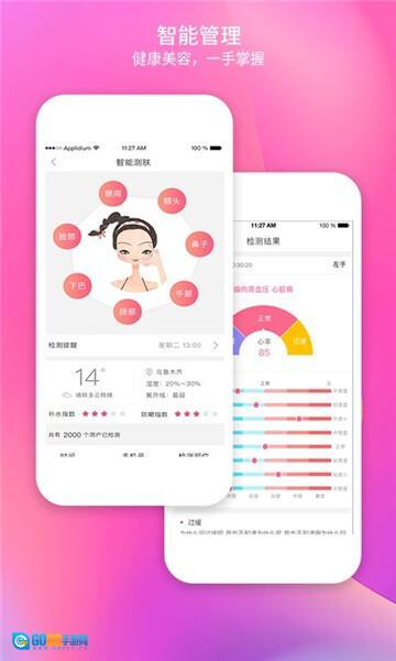 在【智能管理】模块里,完成皮肤检测后就能查看结果分析,得到肤质评分以及对应的护肤建议,点击相关按钮还可以查看专属方案。