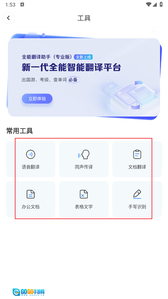 5、点击进入工具板块,这里包含语音翻译、文档翻译等功能,根据自身需求点击对应的功能入口就能使用。