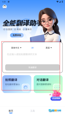 2、进入首页后,可进行文本输入翻译、拍照翻译以及对话翻译操作。