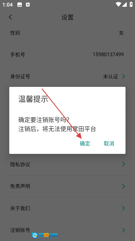 4、在注销温馨提示弹窗里,点击【确定】按钮,即可完成账号注销操作。