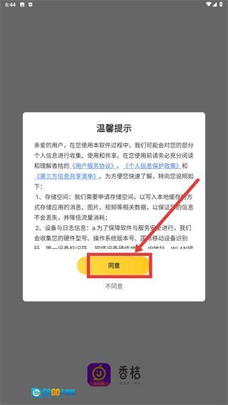 1、在“香桔”的温馨提示界面,点击【同意】按钮,确认接受《用户服务协议》《个人信息保护政策》等相关协议,即可进入应用。