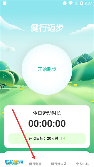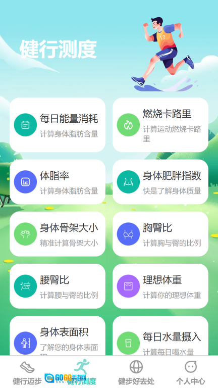 1、在【健行迈步】页面底部找到【健行测度】按钮并点击,即可进入运动健康测度功能页面。
