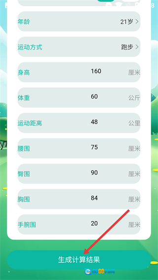 3、进入体脂率数据填写页面后,请依次填写【年龄】【运动方式】【身高】等相关信息,填写完成后点击【生成计算结果】按钮即可。