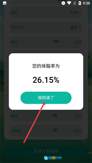 4、当体脂率结果弹窗出现后,查看【体脂率】对应的数值,接着点击【我知道了】按钮,即可结束本次体脂率的计算流程。