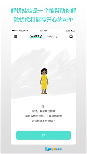 ●【worry】为烦恼页面,点击页面中的【+】添加烦恼,将烦恼告诉解忧娃娃,每一个解忧娃娃对应一个烦恼;