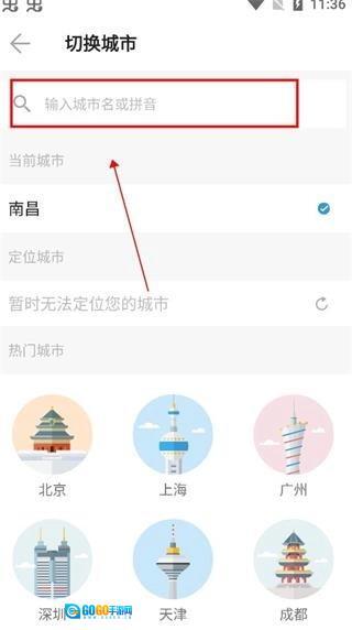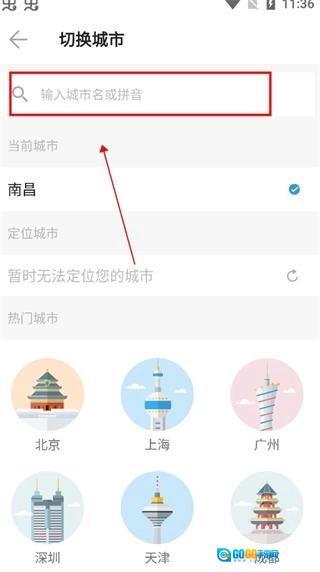 然后第二步。如果定位城市不是自身所在地,这时你也可以切换城市,在搜索栏中输入自己城市即可,如图所示。