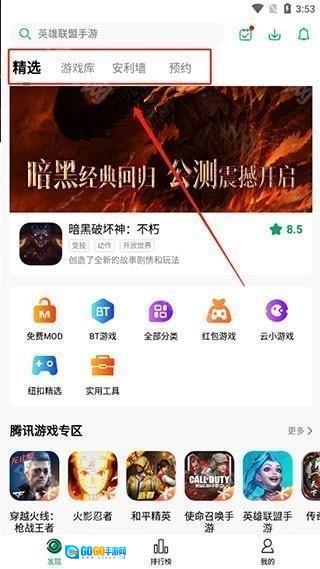 2、登录完成后,在首页我们可以看到精选、游戏库、安利墙和预约等各种板块,用户可以根据自己需要进行点击查看;