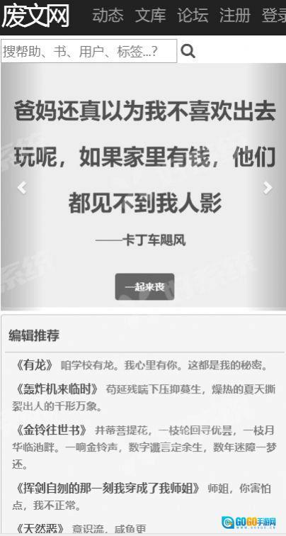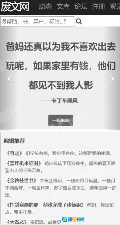 1、废文网,是一个提供用户原创文学作品分享的平台,用户可以在该网站上发布自己的小说、散文、诗歌等文学作品,并与其他用户分享交流。废文网内容丰富,包括恐怖、玄幻、科幻、言情等多种小说题材,并且有专门的编辑团队审核上传的每一篇作品,以确保内容质量。