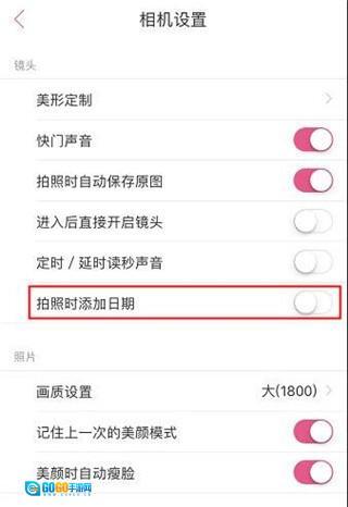 3、进入相机设置界面后,找到“拍照时添加日期”的功能选项,将其右侧的开关开启就可以了。