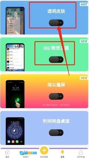 这里提供“透明皮肤”和“QQ/微信主题”功能,若您需要的是透明壁纸,点击“透明皮肤”选项即可。