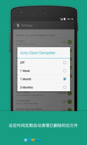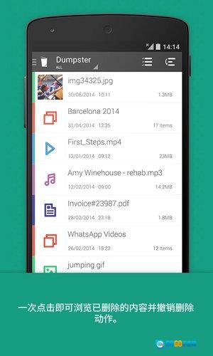 7、最后值得一提的是,Dumpster回收站无法保证之前被删除的文件都能召回,但安装Dumpster之后,宣称你的手机中文件会受到百分百的保护,不会再丢失更多的文件。