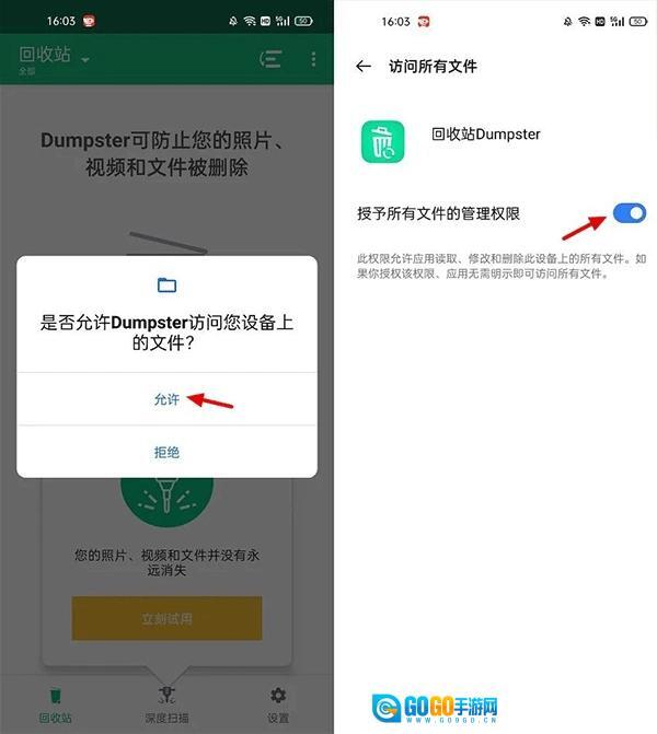 1、首次使用会需要允许「Dumpster」访问设备上的文件,根据提示点击「允许」,再开启权限即可,如图所示。