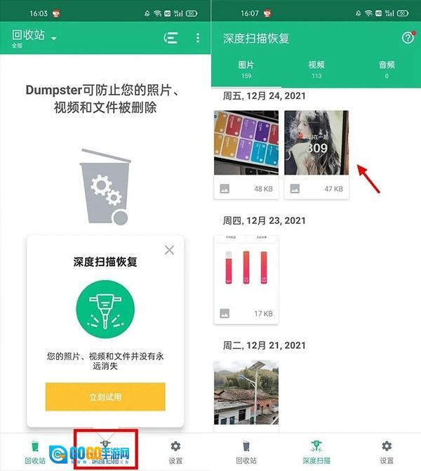 5、其它方面,安装Dumpster之后,今后使用Dumpster删除的图片,可以在左下角的「回收站」中找到,里面可以对再次删除的文件进行恢复,如图所示。