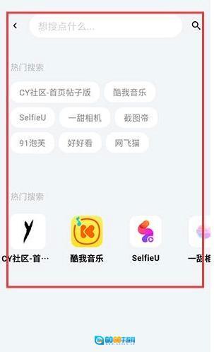 1、打开应用乐园,在界面顶部,点击搜索栏以激活输入状态,在搜索栏内准确录入字符,录入完成后,点击搜索栏右侧的搜索图标,触发搜索操作