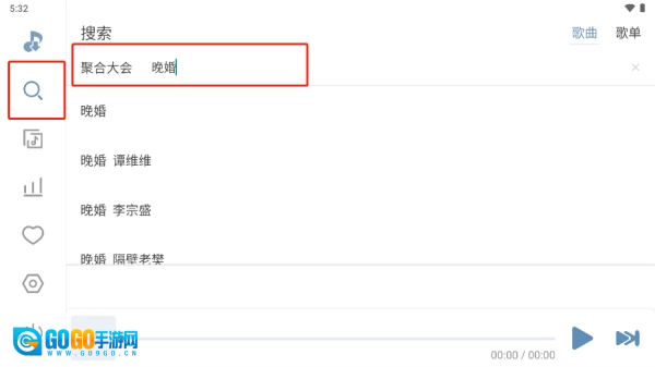 1、我们先打开,然后先点击左侧放大镜,在搜索栏输入歌名