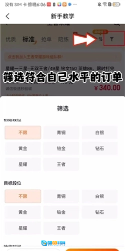 3、接着点击右上角,根据自身条件筛选符合自己水平的订单