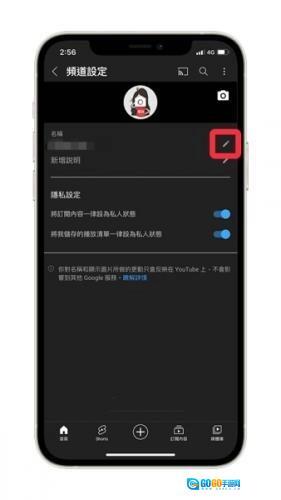 4、进入「频道设定」页面后,点击「名称」右侧的「铅笔编辑」图标。YouTube修改频道名称(YouTube手机版):选择「编辑」。