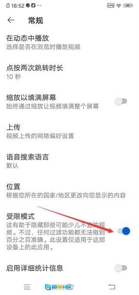 4、找到最下方的“受限模式”选项,点击即可关闭;该模式呈蓝色时为开启状态,呈灰色时则是关闭状态。