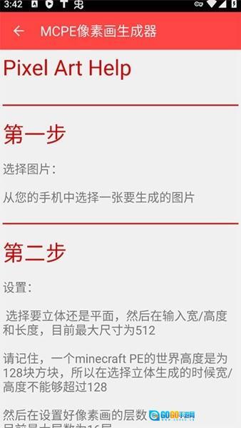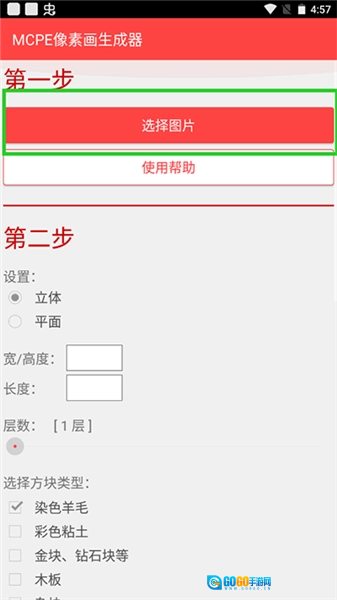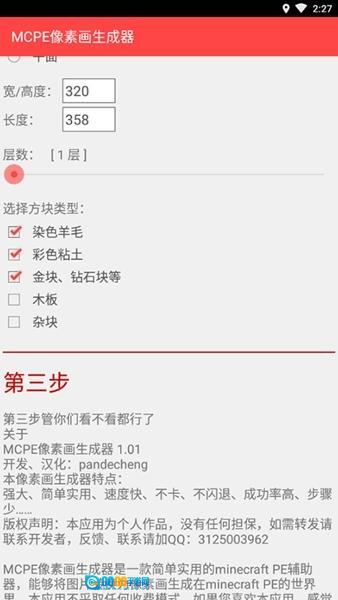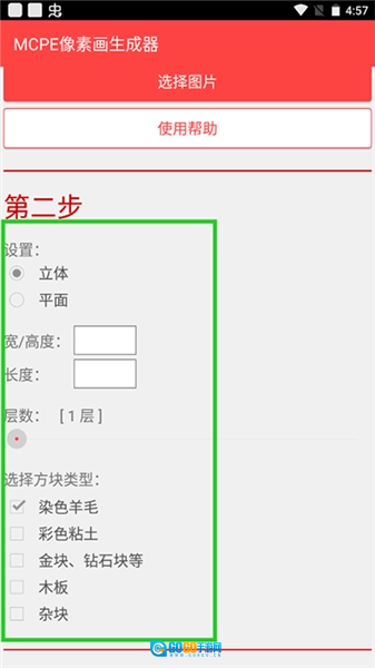 2、接下来选择生成立体还是平面的像素画,然后输入宽/高度和长度参数。目前支持的最大尺寸为512,但需要注意的是,Minecraft PE的世界高度限制为128块方块,因此选择立体生成时,宽/高度不能超过128。之后设置像素画的层数,当前最大层数为16层。建议将尺寸控制在300以内,层数最多选择6层,因为尺寸和层数越大,生成所需的时间会越长。