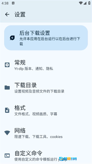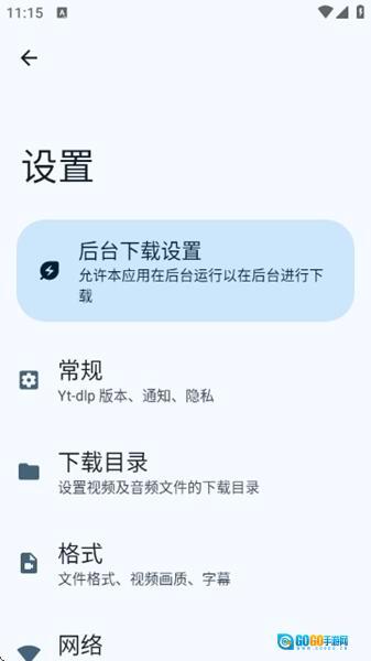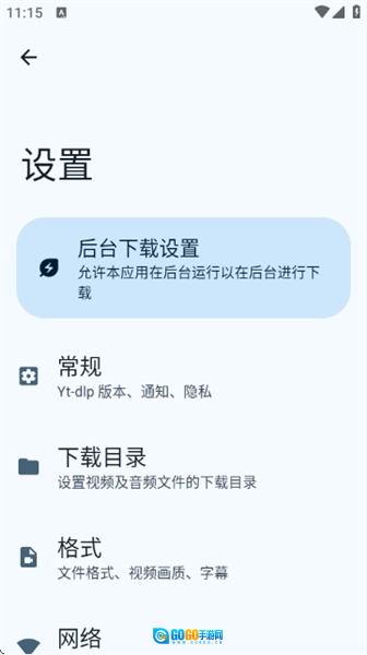 点击左上角的设置图标,即可进入设置界面,在这里能够对后台、常规(包括Yt-dlp版本、通知、隐私)、目录、格式、网络等各项内容进行配置。