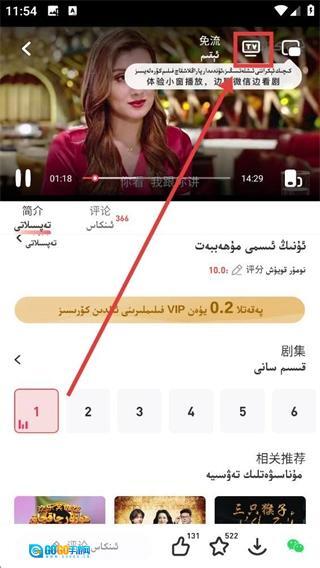 在播放界面点击顶部的【TV】图标,即可开启投屏功能选项,为将内容投射到电视做好准备。
