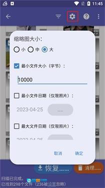 3、我们点击设置按钮,用户可以根据文件大小、日期等等进行照片的筛选,以便更好的恢复图片;