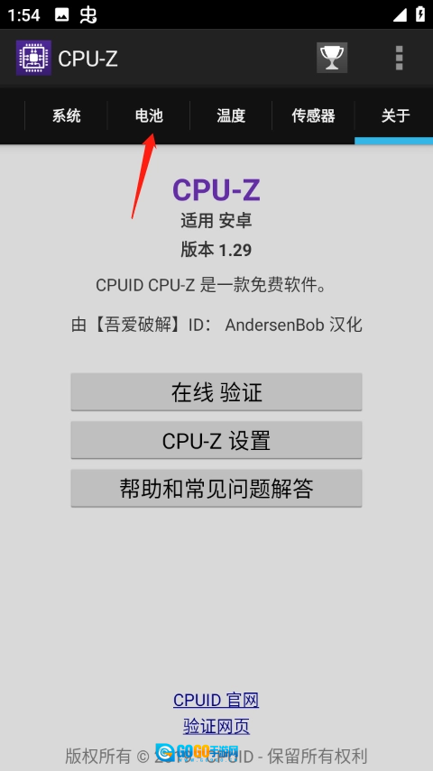 在魔趣网(m.mfun.com)上找到并安装CPUZ软件,安装完成后打开该软件,接着点击界面中的“电池”选项。