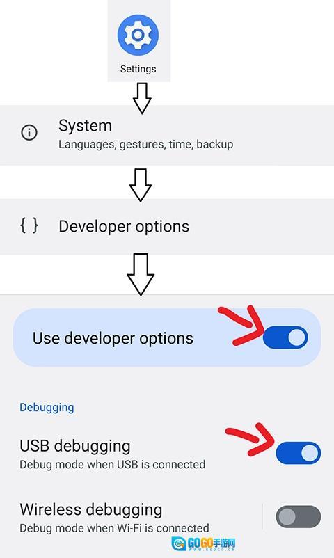 2、将“开发者选项”以及“USB 调试”功能予以启用。