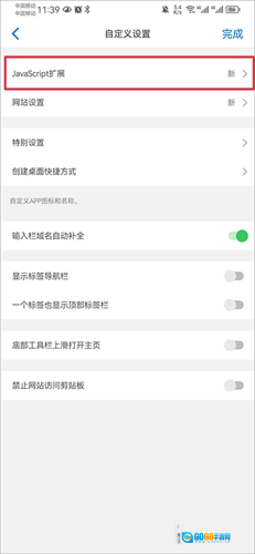 4. 进入“自定义设置”页面后,点击“JavaScript扩展功能”选项。
