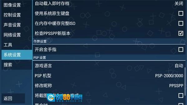 1、打开PPSSPP模拟器,依次点击游戏设置--系统设置--开启金手指(打勾)。