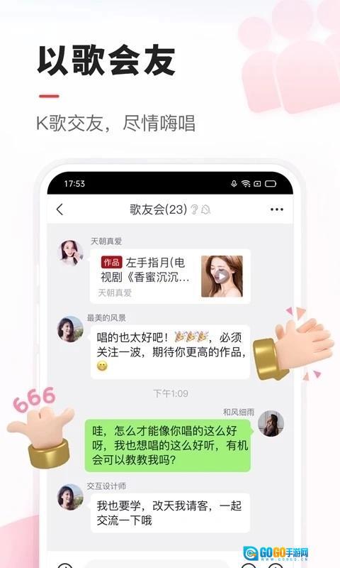 3、【更多人交流】围绕歌曲展开讨论、进行聊天互动,借助歌曲寻找志同道合的知音,吸引更多粉丝关注并倾听你的声音;与偶像近距离接触,给达人发送私信对话,一键完成分享,随时让好友听到自己的作品。
